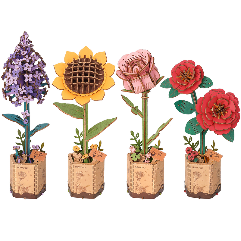 This DIY Flower Wooden Puzzle Bundle is a delightful pack of ALL four charming blooms: Sunflower, Lilac, Red Camellia, and Pink Rose.