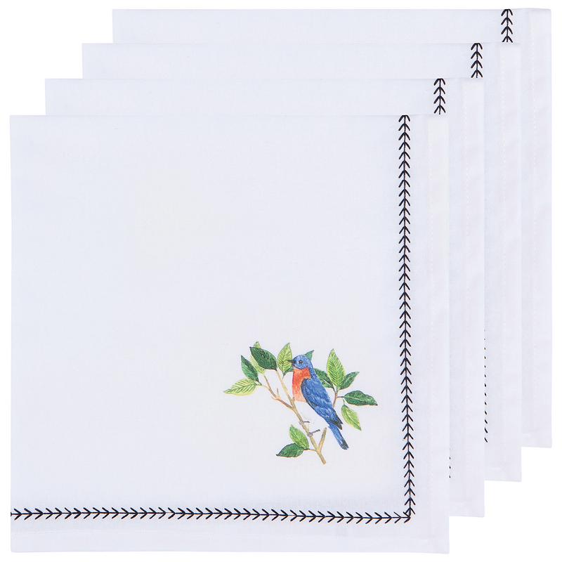 This set of four napkins is a great addition to kitchens and dining rooms: indoors and out. each napkin measures 18 inches square and is made from 100% cotton. Pair with matching birdsong tablecloth from now designs.