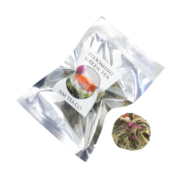 Blooming teas (also known as display teas) are a novel form of leaf preparation. Green tea leaves are hand sewn around select flowers and dried into spheres. When submerged in water, they slowly unfurl as the leaves saturate and \"bloom\" into intriguing forms. You can serve the green tea and add more water to retain the display. For fullest enjoyment, prepare this tea in a glass vessel and take the time to watch it gradually express.