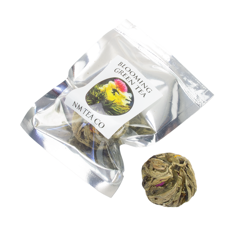 Blooming teas (also known as display teas) are a novel form of leaf preparation. Green tea leaves are hand sewn around select flowers and dried into spheres. When submerged in water, they slowly unfurl as the leaves saturate and \"bloom\" into intriguing forms. You can serve the green tea and add more water to retain the display. For fullest enjoyment, prepare this tea in a glass vessel and take the time to watch it gradually express.