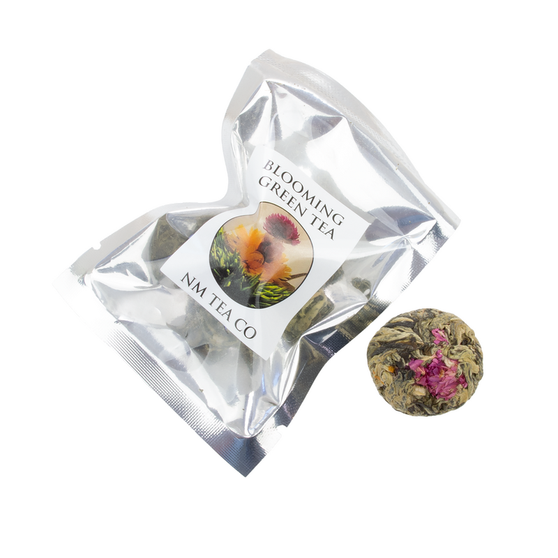 Blooming teas (also known as display teas) are a novel form of leaf preparation. Green tea leaves are hand sewn around select flowers and dried into spheres. When submerged in water, they slowly unfurl as the leaves saturate and \"bloom\" into intriguing forms. You can serve the green tea and add more water to retain the display. For fullest enjoyment, prepare this tea in a glass vessel and take the time to watch it gradually express.