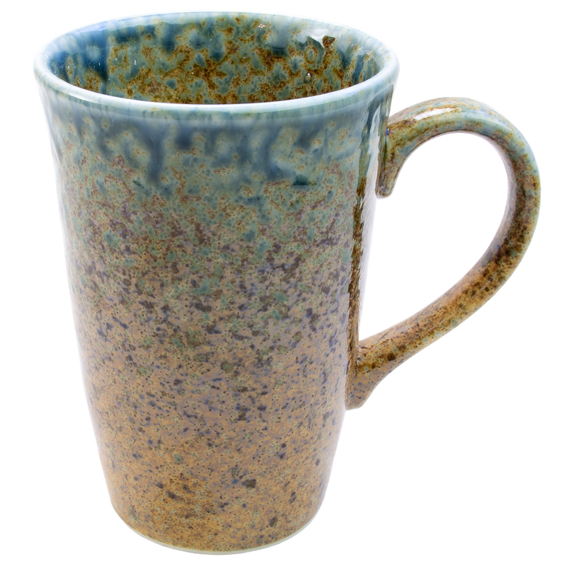 This tall mug warms the fingers during cold temperatures whilst minimizing counter space. Please note: glaze coloring (balance of green/brown) may vary.