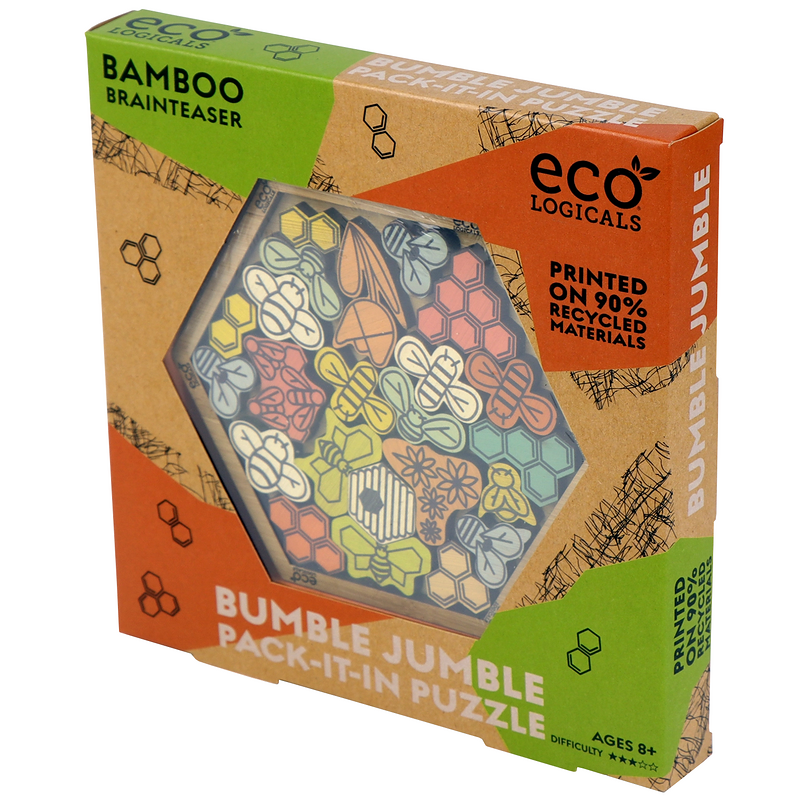 Pack-it-in style puzzle made entirely of bamboo. Arrange the pieces so that all bees fit into the hive.