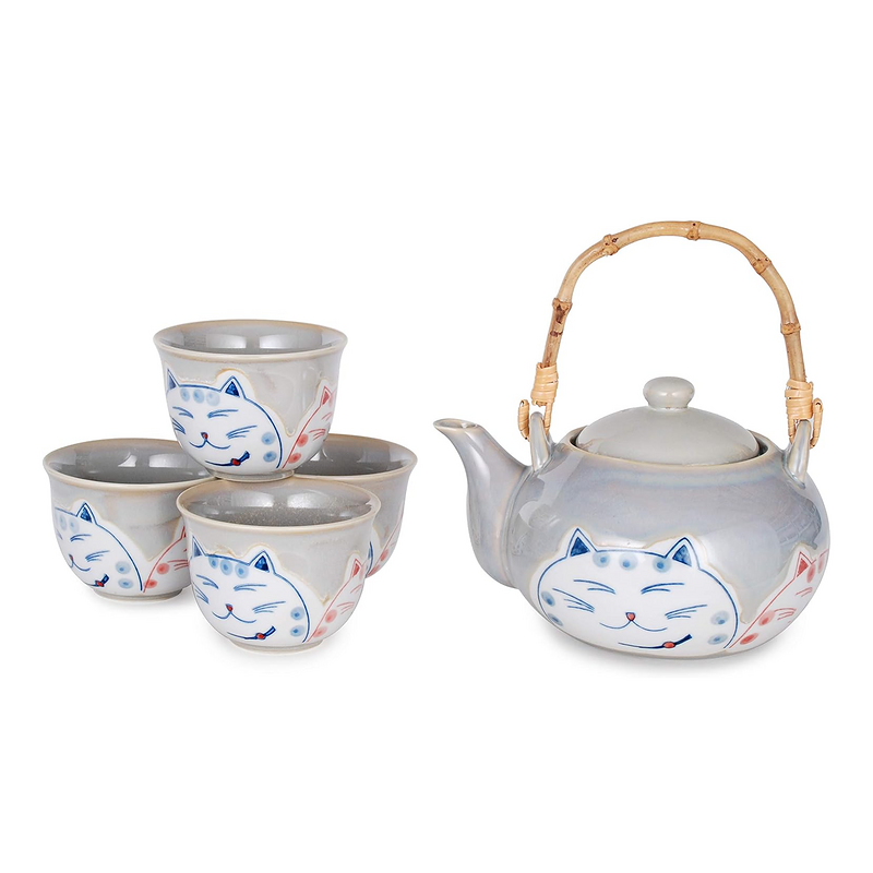 Set comes with four cups and tea pot with removable bamboo wrapped wire handle and stainless steel mesh infuser.