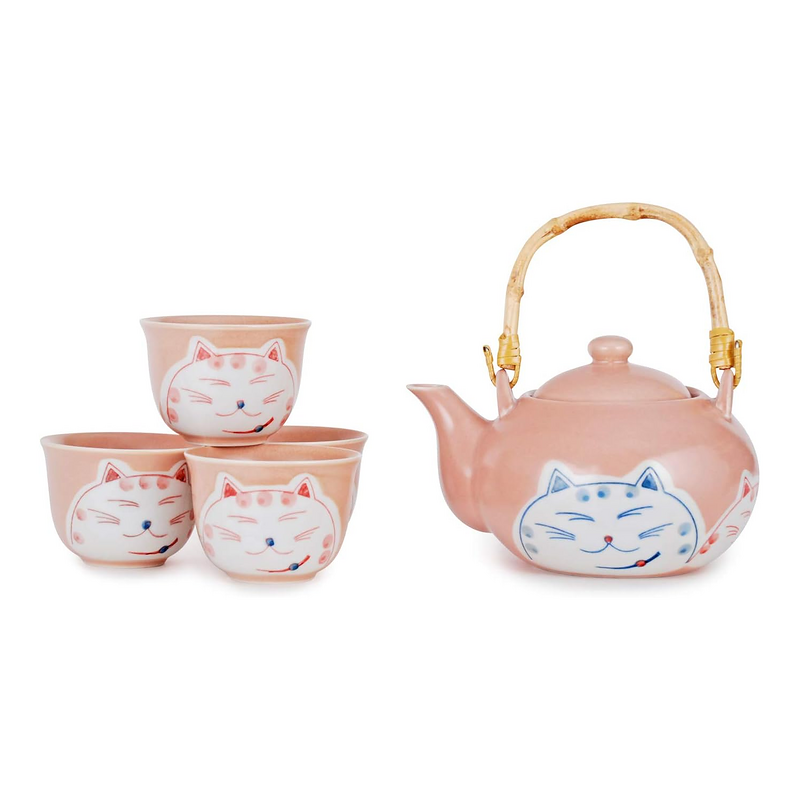 Set comes with four cups and tea pot with removable bamboo wrapped wire handle and stainless steel mesh infuser.