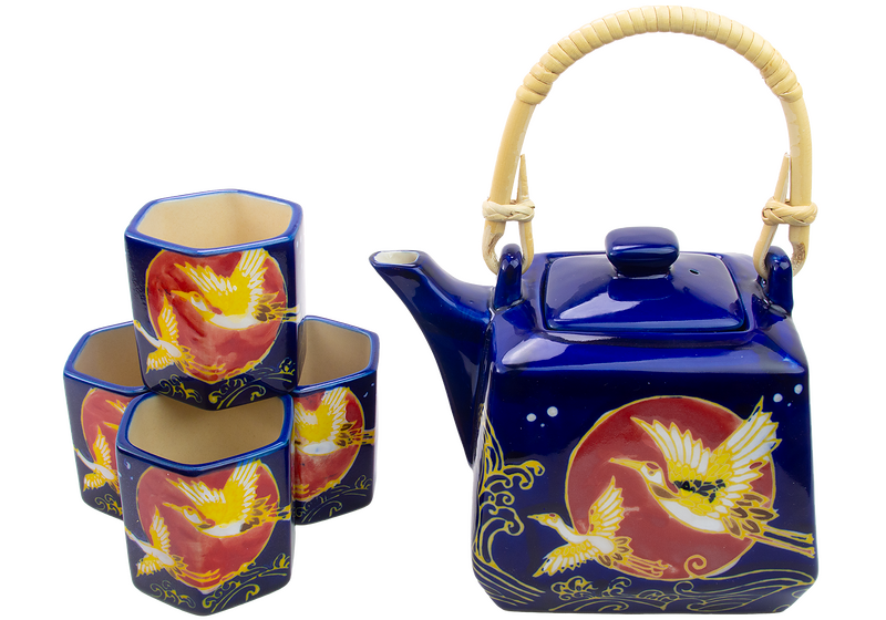 This tea set comes with four cups and mesh infuser.