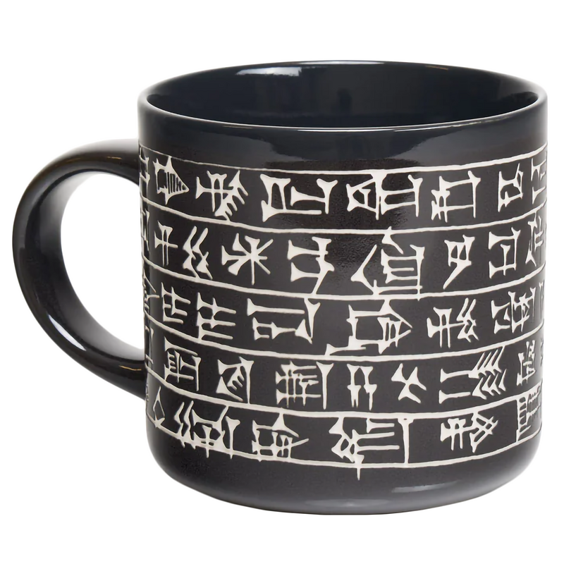Muse on the wonders of linguistics and the ancient Mesopotamian world. The intricate cuneiform script, with its elegant lines and wedge-shaped characters, represents the earliest form of writing and evokes the richness of ancient civilization. This mug's bold black and white design adds a modern twist to this timeless art, making it the perfect addition to your collection.