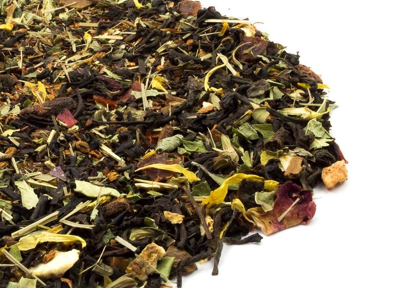 - Black tea, rooibos, lemon balm, lemongrass, lemon verbena, apple, strawberry, orange, hibiscus, rose hips, rose, clove, cinnamon, safflower, sunflower