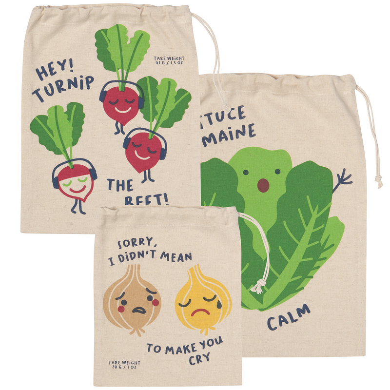 Amuse those around you with the colloquial puns on this set of 3 funny food produce bags by now designs. The sayings of playful, colorful veggies "beet" boring grocery bags every time and add joy to your fresh produce shopping trips.