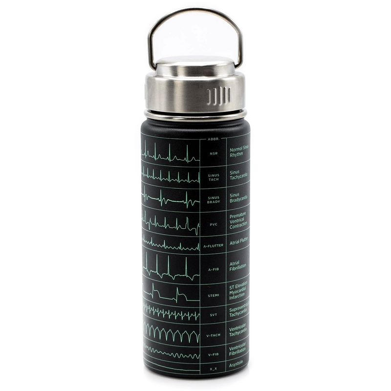Study your cardiac rhythms while keeping hydrated! Nicer looking than an EKG pocket guide, this Heartbeat Flask is both functional and aesthetic. Nicer looking than an EKG pocket guide, this heartbeat travel bottle is both functional and aesthetic. Fill it with ice cold water and take it to the gym for your cardio workout, or top it off with coffee for a long night shift in the cardiac ward.