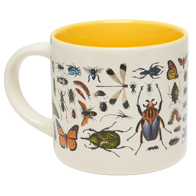 Flutter & Fly mug, a charming full-color addition to your collection! This ceramic mug features full-color illustrations of beautiful butterflies, moths, and beetles with a sunny marigold pop-color inside. Whether you're enjoying your morning coffee or afternoon tea, this mug is the perfect way to add a little entomological wonder to your routine.