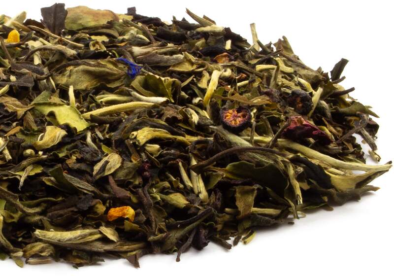 - White tea, hibiscus, blue- berries, currants, cornflower petals with ice wine (no alcohol) and other natural flavor.