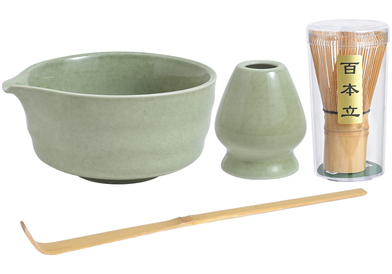 Just add matcha! This kit contains all the tools needed to get started. A sturdy and beautiful ceramic "winter" bowl, a matching stand to properly maintain the shape of your whisk, as well as the bamboo spoon and whisk.