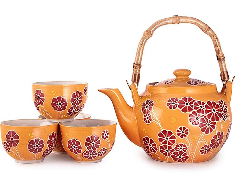 This tea set comes with four cups and mesh infuser.
