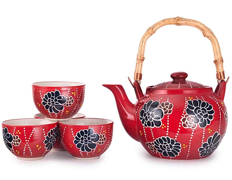 This tea set comes with four cups and mesh infuser.