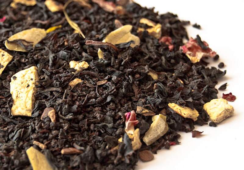 - Black Tea, Orange Peel, Apple Pieces, Almond Slices, Cinnamon Chips, and Rose Petals, with Natural and Artificial Flavoring