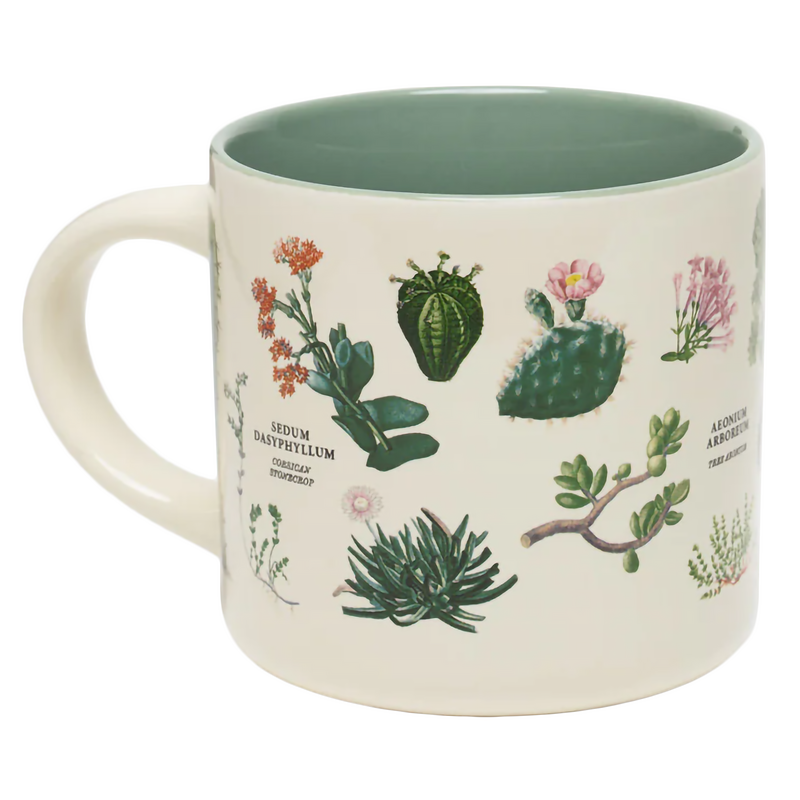 If you've been searching for the perfect mug to showcase your love of succulents, your quest ends here. With full-color illustrations of some of your favorite low-water plants and a delightfully cactus-colored pop-color inside, this is the succulent mug you've been longing for. Fill it with your favorite hot beverage and sip while you tend to your houseplants.