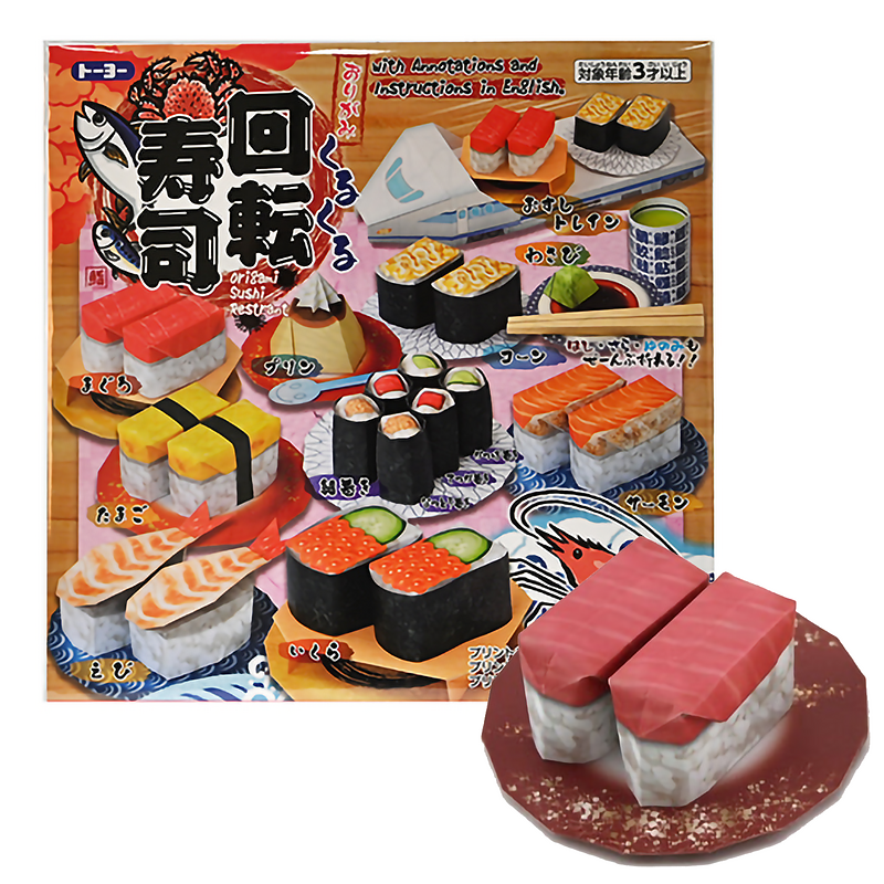 Japanese origami 30 paper pack to create an origami sushi restaurant. Paper measures 15 cm x 15 cm. Kit needs glue and scissors to complete.