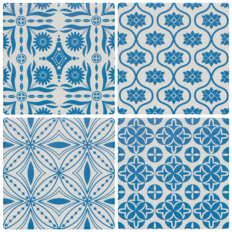 Celebrate the rich creative traditions of North Africa with our blue and white Tangier Soak Up Coasters from Now Designs. Crafted from porous stoneware, this striking set of 4 drink coasters protects your surfaces from cold and hot beverages alike. The quality construction allows each one to soak up condensation and small spills, resulting in drip-free glasses and mugs. The cork base offers a smooth barrier to shield table tops or counters from scratches. Each set comes attractively boxed, making an ideal gift for housewarming parties or a generous hostess.