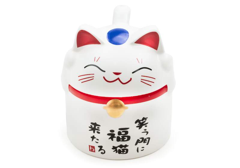 This cute kitty waits patiently on your shelf until the next use. Tail and ears support the mug when upright.