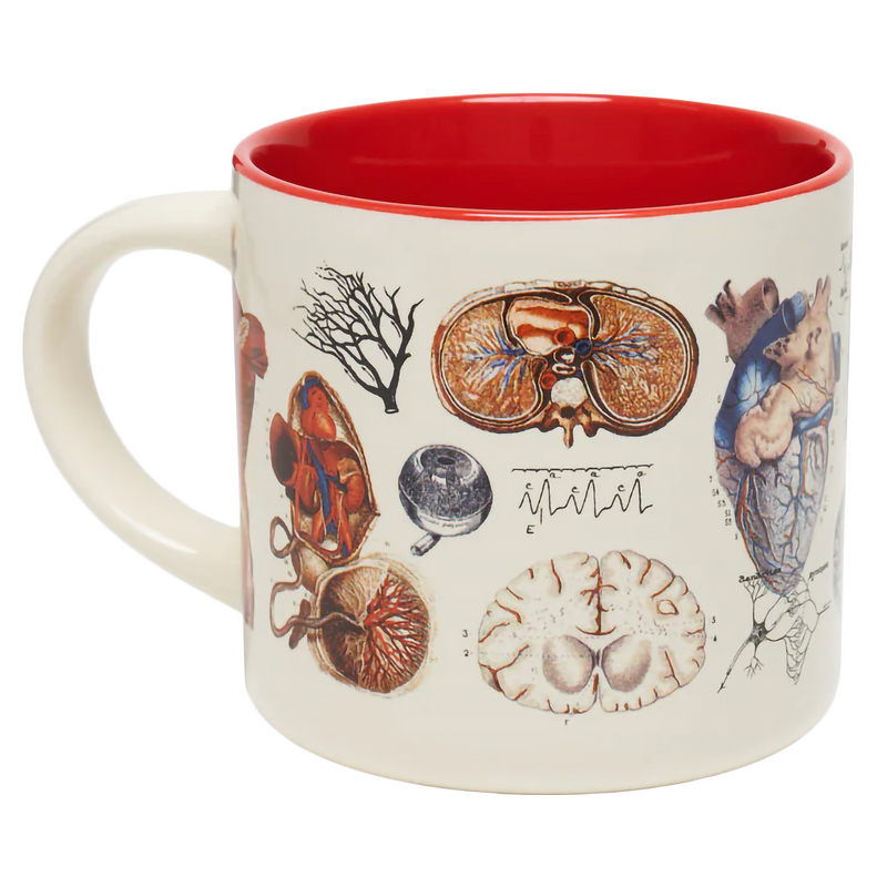 Get lost in the inner landscape of human anatomy while you sip your morning brew from this Vascular Anatomy ceramic mug. Will full-color medical illustrations on the outside and a bold red pop-color inside, this mug is the perfect way to enjoy your morning brew.