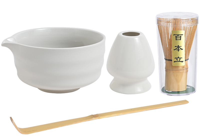 Just add matcha! This kit contains all the tools needed to get started. A sturdy and beautiful ceramic "winter" bowl, a matching stand to properly maintain the shape of your whisk, as well as the bamboo spoon and whisk.