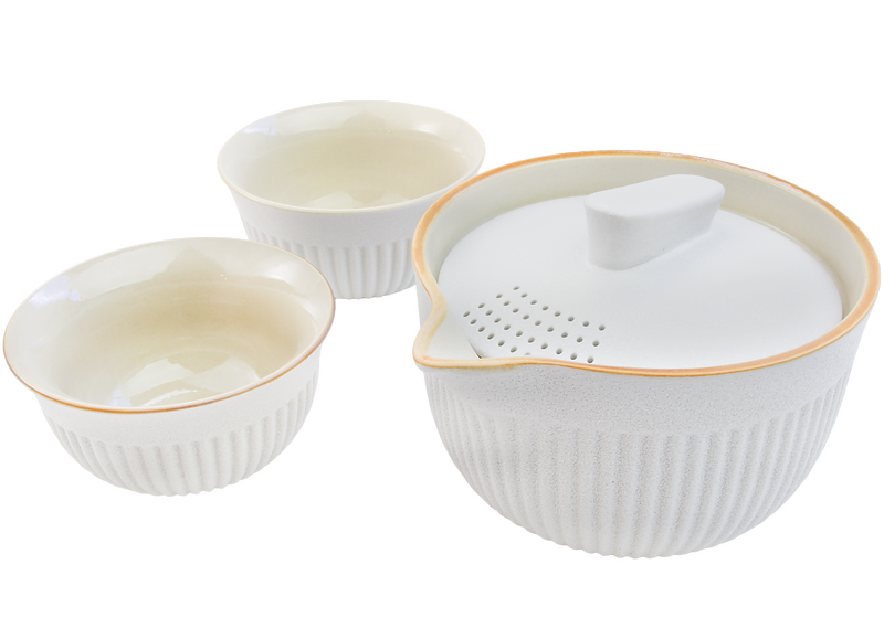 Gong fu cha literally translates as "right effort tea." The right tools allow for perfect brews, at home or on the go! This tea-for-one set includes a cup, a tea bowl, and a leaf-straining pot, all of which are contained in a convenient carrying case.