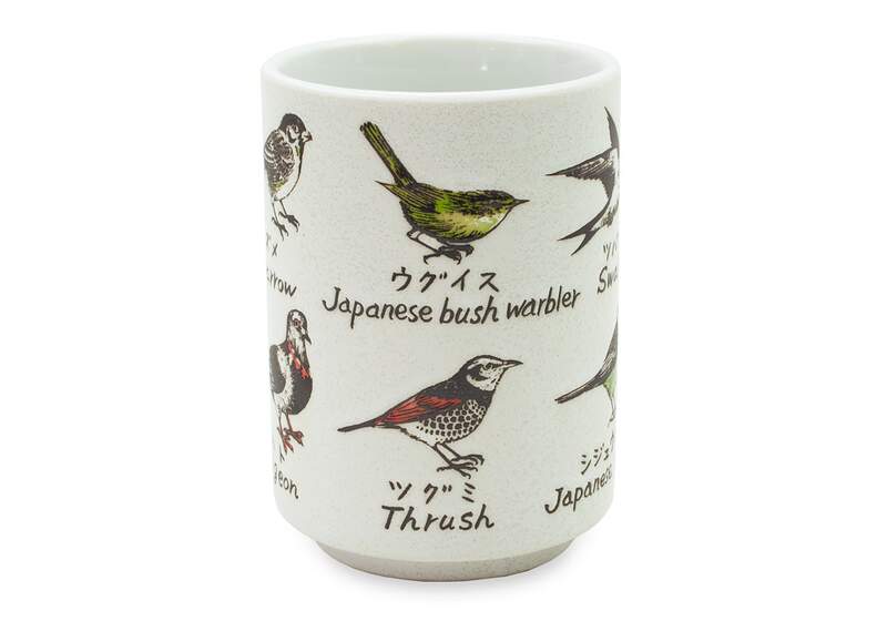 A beautiful ceramic cup with common birds, listed with the Japanese Kanji name.