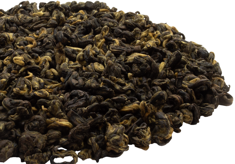 A bold-leaf Yunnan varietal with smooth cocoa notes and hints of plum and spice. The dry leaves are tightly rolled into a spiral snail shape, dark in color, with golden tip accents. Named for the twisted shape of the finished leaves - fancifully reminiscent of snail shells. The brew is moderately hearty in a longer infusion or can be reinfused about three times with briefer steeps.