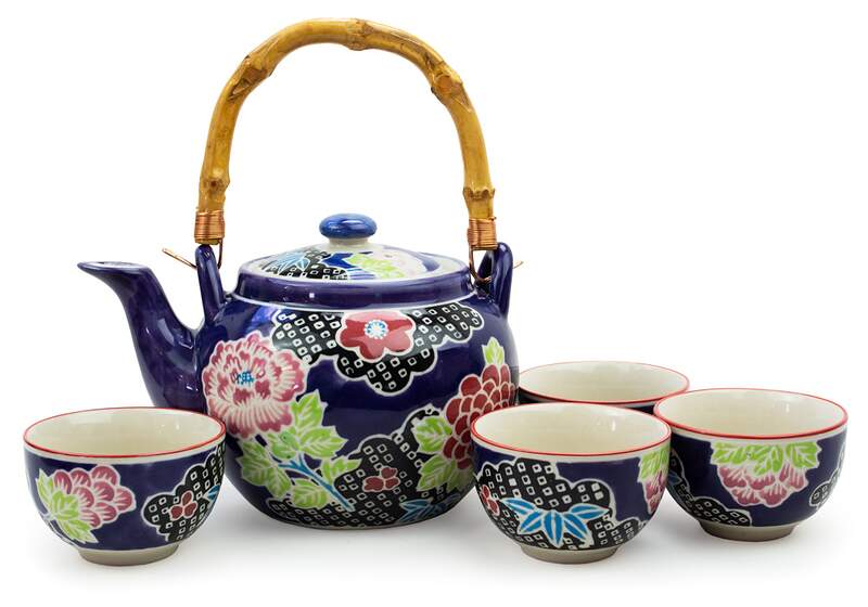 This tea set comes with four cups and mesh infuser.